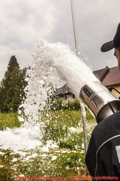 Die Kameraden nutzten nach dem einleitenden Theorieteil von AW Roland Weber die Möglichkeit unter Anleitung von AW Martin Achatz das Wissen um die Schaumerzeugung aufzufrischen und die Theorie sofort in die Praxis umzusetzen.