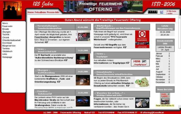 Am Abend des 30. Oktobers 2001 wurde die allererste Homepage der Feuerwehr Oftering öffentlich zugänglich gemacht. Seit damals hat sich viel im Aussehen geändert, doch der Zweck blieb immer der gleiche - zeitnahe und umfangreiche Information über die Arbeit der Feuerwehr Oftering für Ofterings Bevölkerung und Interessierte.