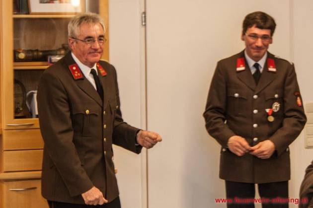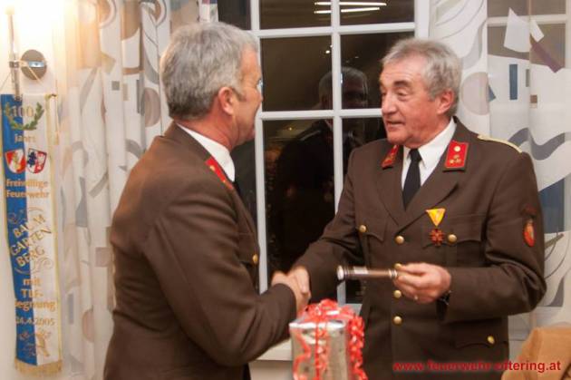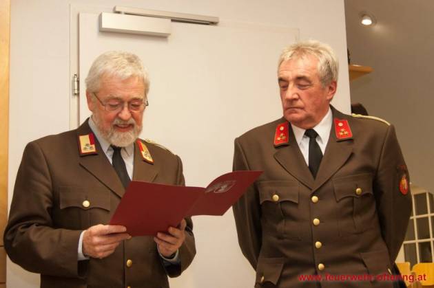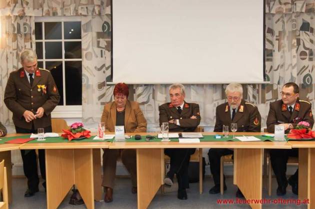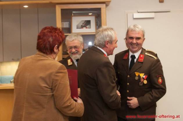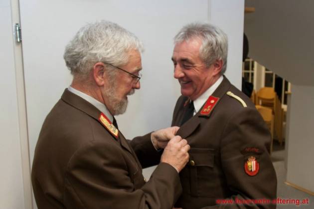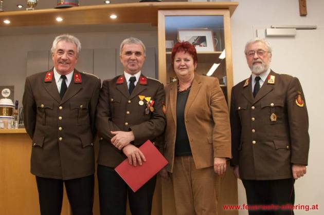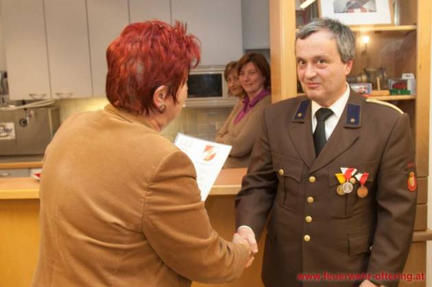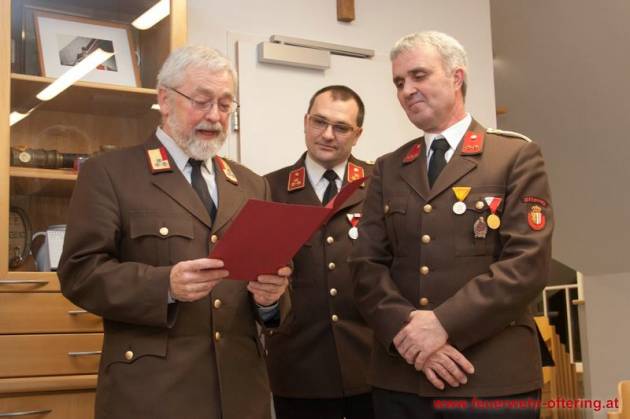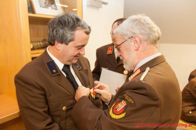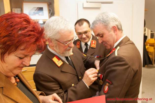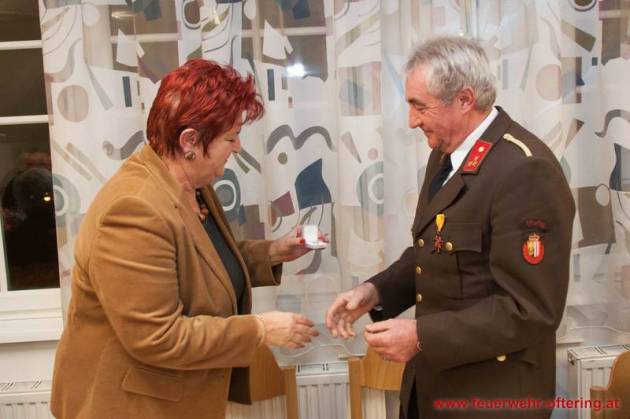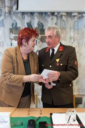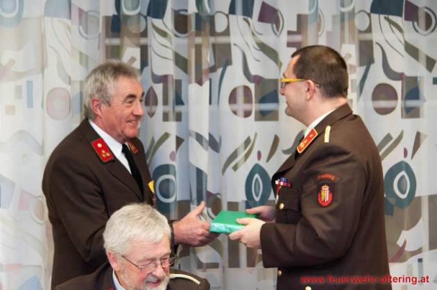 Mit dem Ende der Funktionsperiode wurden selbstverständlich auch verdiente Kameraden geehrt. Franz Meindlhumer führt bereits seit 25 Jahren die Kassa der Feuerwehr Oftering, und stellte sich später zum 6. Mal der Wahl.