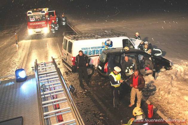 Auf der Paschinger Landesstraße L1227 in der Ortschaft Jebenstein sind ein PKW und ein Mopedauto frontal zusammengestoßen. Die drei Insassen des zweiten Fahrzeuges waren leicht verletzt.