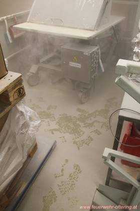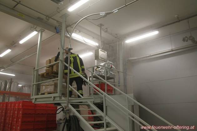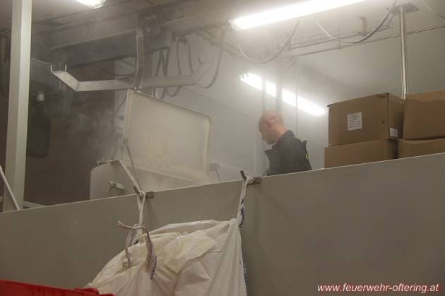 Nach Eintreffen der ersten 3 Fahrzeuge wurde umgehend mit der Erkundung des Gebäudes begonnen. Nach Feststellung der Lage des Melders 222/04 wurden die Feuerwehrkameraden auf Mitarbeiter der Putzfirma aufmerksam, welche bereits auf die Feuerwehr gewartet hatten. Sie konnten jedoch auch keine Hinweise auf die Ursache geben. Schlussendlich konnte wieder eine Produktionsanlage im 2. OG ausgemacht werden, welche eine deutliche Staubentwicklung aufwies. Ansonsten konnte keine weitere Gefahr festgestellt werden.
