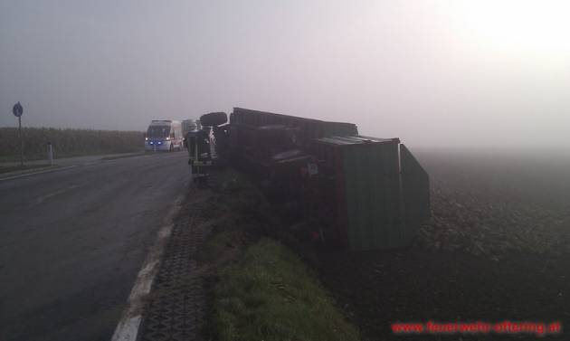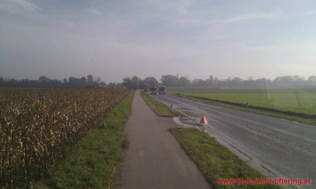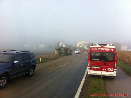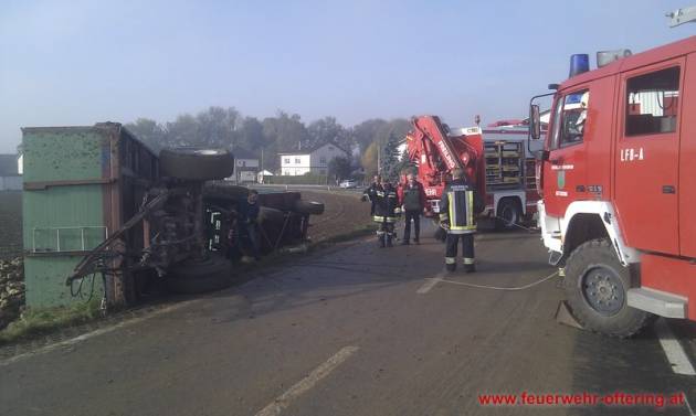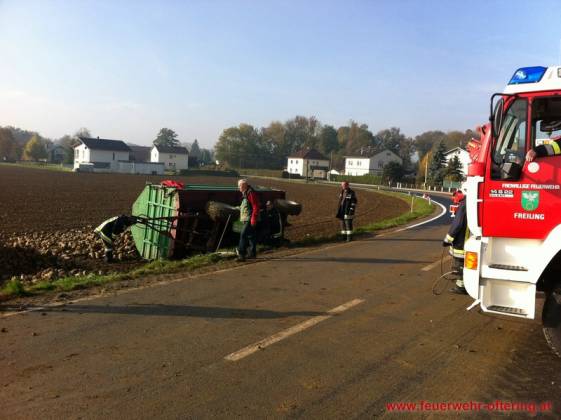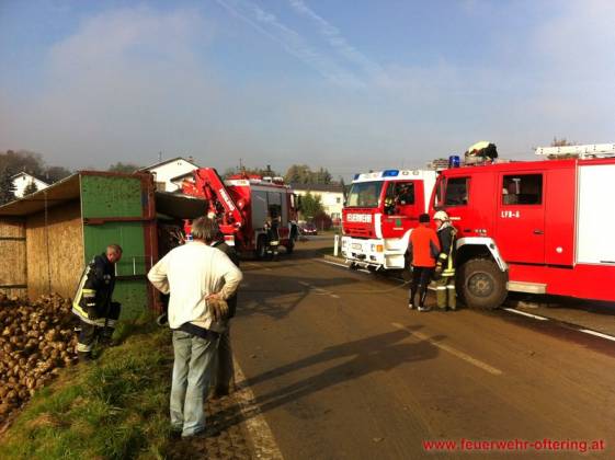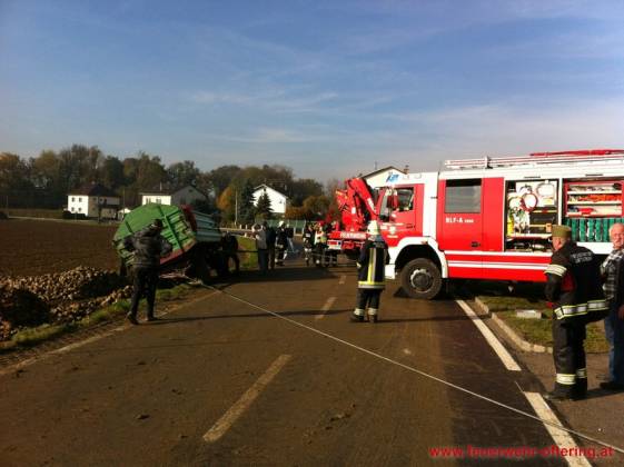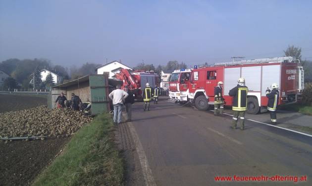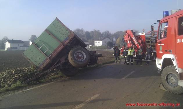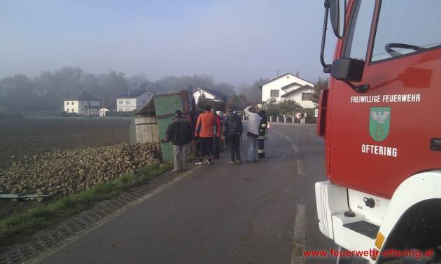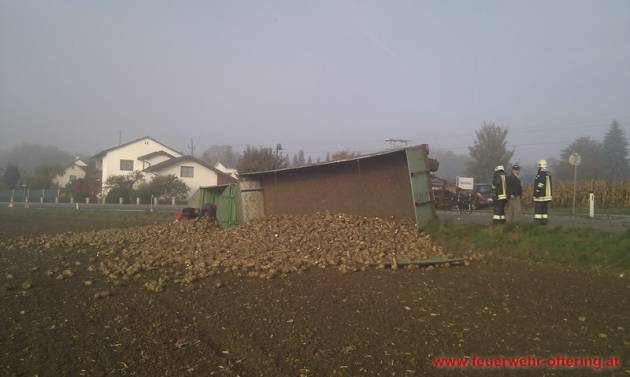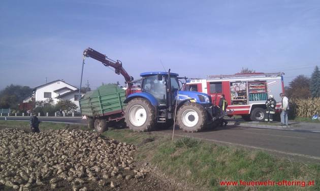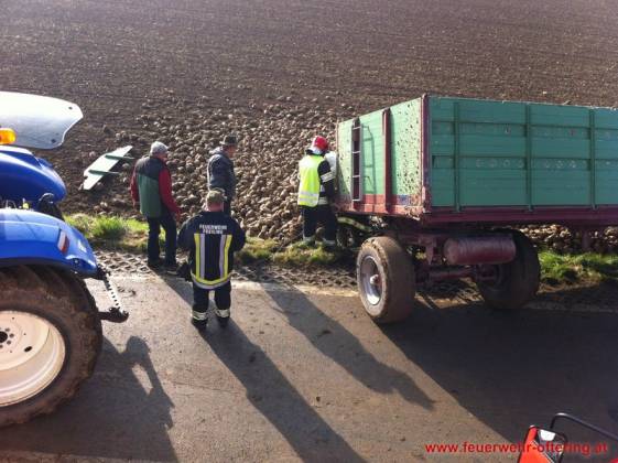 Am Vormittag des 21. Oktober rutschte ein voll beladener Rübenzug über eine Böschung und kippt um - der Traktor blieb glücklicherweise auf der Straße, sodass es nur Sachschaden gab. Die Bergung war jedoch langwierig.