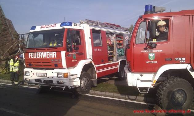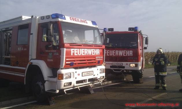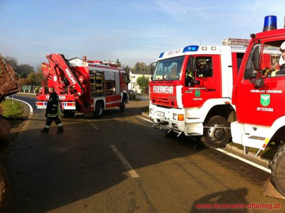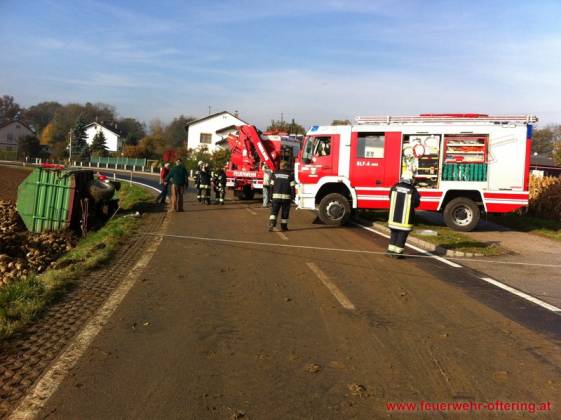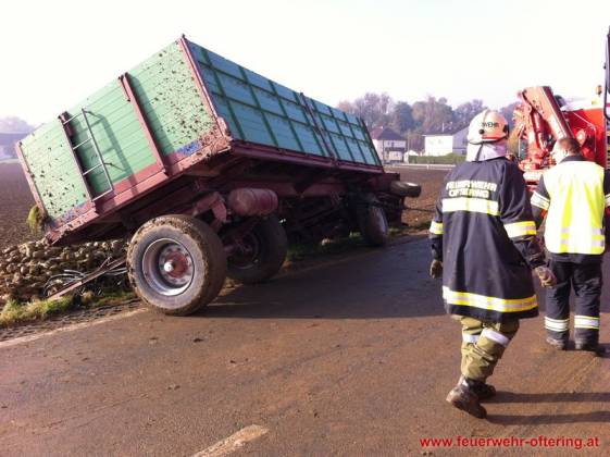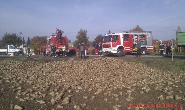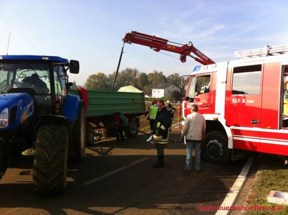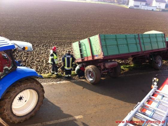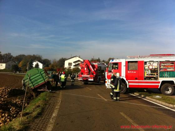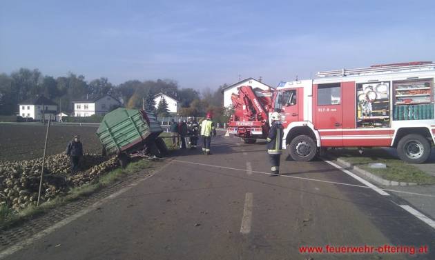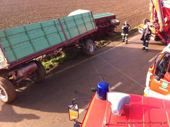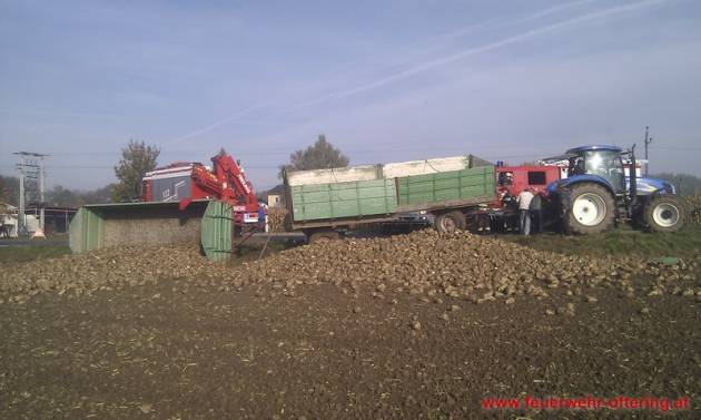 Die alarmierten Einsatzkräfte fanden zwei in einem Feld liegende Anhänger mit Zuckerrüben vor. Der Traktor war bereits von den Hängern abgehängt worden und war unbeschädigt. Bei einer ersten Lagebesprechung wurde die Vorgehensweise der Bergung der Hänger besprochen. Nachdem die Ernte auf dem ersten Feld beendet war und die Vorbereitungsarbeiten erledigt, wurde die Marchtrenker Straße gesperrt und gemeinsam von den Wehren Freiling und Oftering mittels Seilwinde und zusäztlichen Fahrzeugen zur Seilumlenkung beide Anhänger schonend wieder aufgerichtet und auf die Straße gestellt.