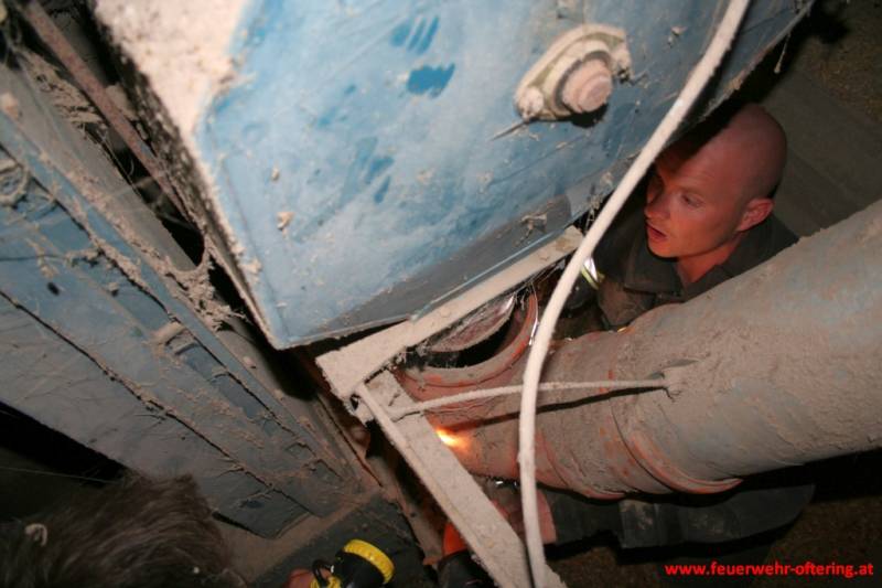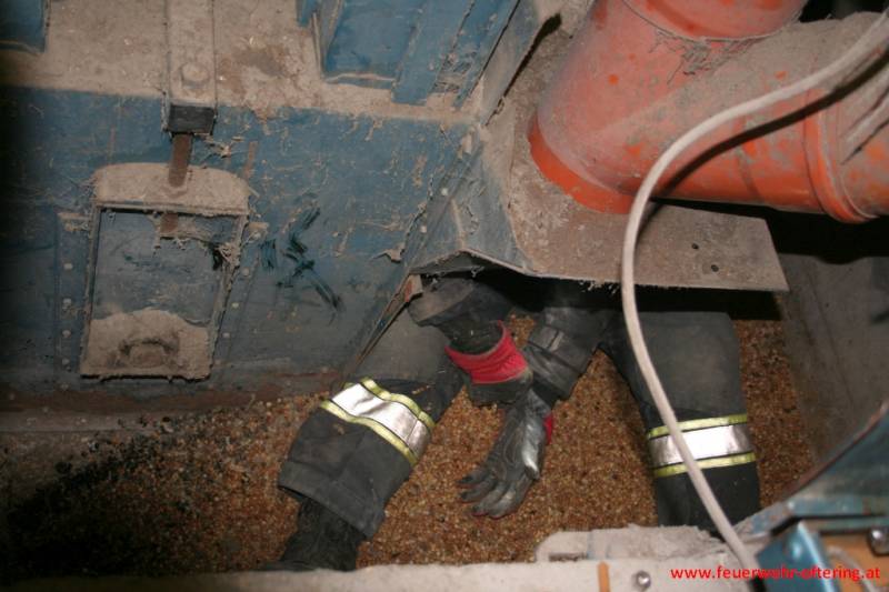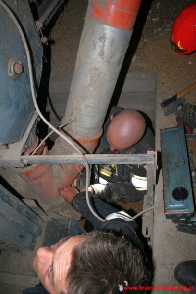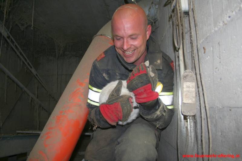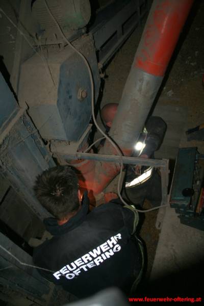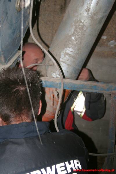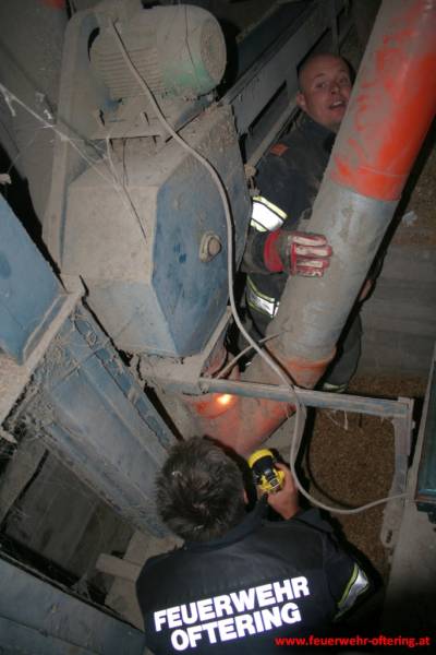 Um 23:50 rief die mehr als besorgte Katzenbesitzerin erneut an, mit dem Hinweis auf den sicheren "Aufenthaltsort" der Katze. Ihr Freund hatte das Tier kurz zuvor gesehen, bevor es weiter abstürzte. Während die Einsatzkräfte auf gut Glück den Elevator in der landwirtschaftlichen Silo-Anlage untersuchten, konnte ein Kamerad die Ohren und Teile des Kopfes der Katze sehen, und die missliche Lage bestätigen. Nach der raschen Demontage einiger Teile war der 4-Beiner kurz darauf gerettet und konnte erschöpft und verschreckt der mehr als glücklichen Besitzerin übergeben werden.