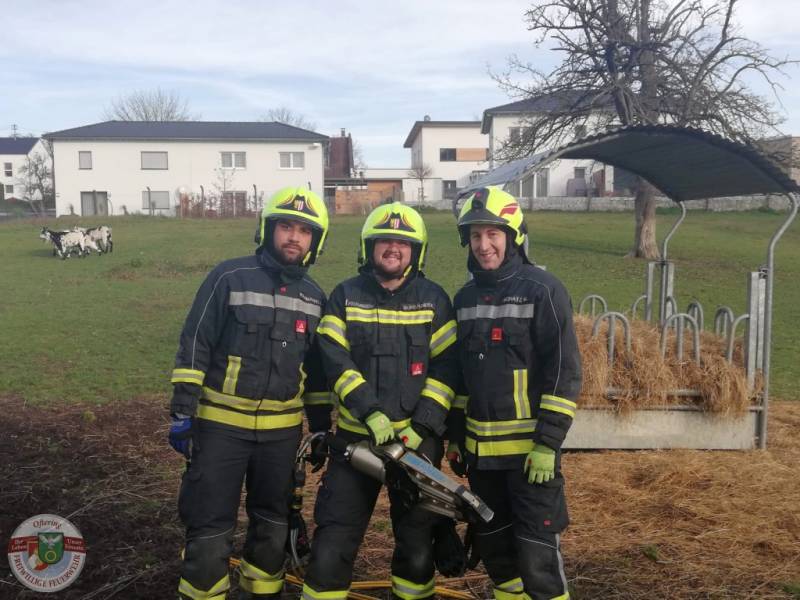 Minutengenau fünf Wochen nach unserem letzten Ziegen-Einsatz, wurden wir erneut zu einer feststeckenden Ziege alarmiert. Den angerückten Kameraden bot sich dasselbe Bild, wie beim letzten Mal. 100%ig sicher sind wir uns nicht, aber die Indizien deuten auf das gleiche Opfer hin (es gibt mehrere Tiere, die eine ähnliche Zeichnung aufweisen). Binnen weniger Minuten konnte das Tier, problemlos und unverletzt, mit dem Spreizer befreit werden.
