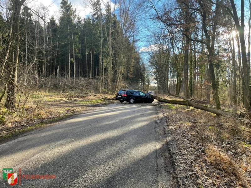 Beim dritten Einsatz war ein Baum auf ein fahrendes Auto gefallen. Zum Glück wurde das KFZ nur im vorderen Bereich getroffen.