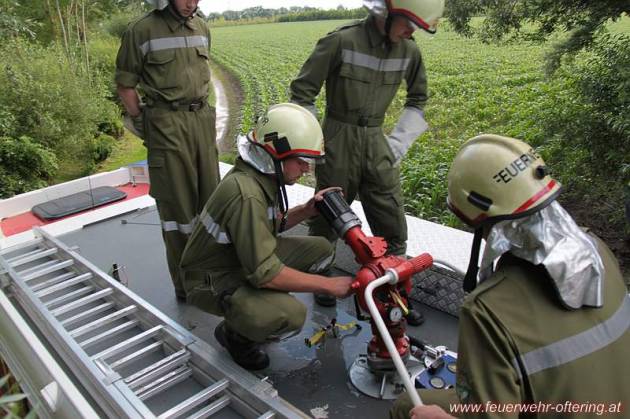 Wasser auf möglichst viele Arten in das TLF und aus dem TLF wieder herauszubekommen war Übungsthema der Gruppenübung im Juni. Der Ertl-Teich in Oberbachham diente hierfür als Wasserentnahmestelle.