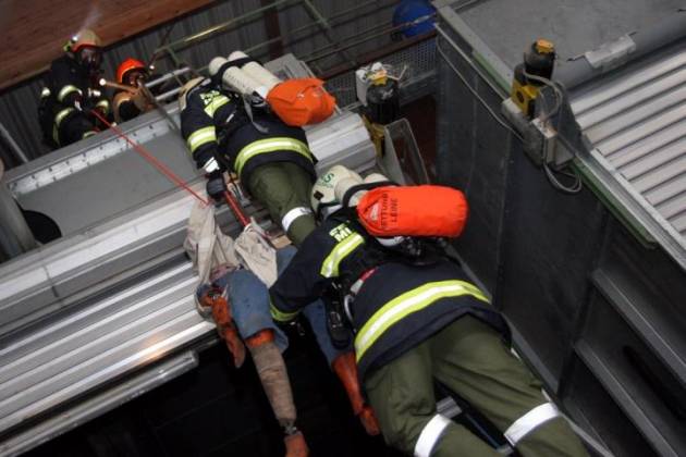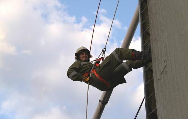Ein 12m hoher Silo diente als Übungsobjekt für die praktische Übung von Rettungstechniken aus großer Höhe.