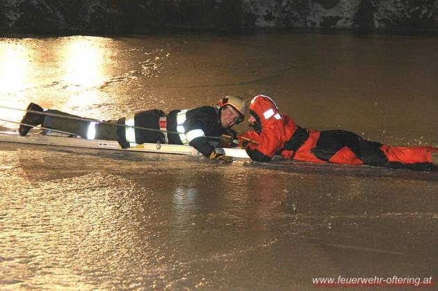 Aufgrund der passenden Temperaturen wurde die Thematik Rettung von in Eis eingebrochenen Personen auf einem Teich praktisch unter realen Bedingungen beübt.