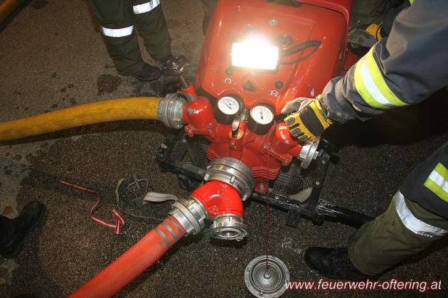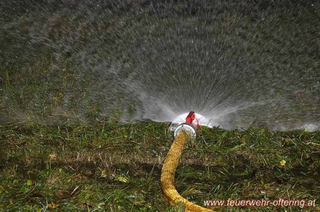 Im ersten Übungsteil wurde der Hydrant beim Feuerwehrhaus, welcher vorerst das Ende der Ortswasserleitung darstellt einem Leistungstest unterzogen, um im Einsatzfall von realistischen Leistungswerten ausgehen zu können. Erwartungsgemäß zeigte sich, dass die Leitung keine "Wunder" vollbringen kann, und die Leistung bei unter 1000l/min liegt.
