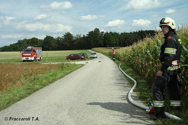 Zweite Gemeinschaftsübung für die Feuerwehr Oftering an einem Wochenende - nun ausgerichtet von der FF Holzhausen. Gemäß Alarmplan wurde mit TLF-A 2000/200 ausgerückt. An der Übung waren neben der ausrichtenden Wehr auch die Feuerwehren Axberg, Mistelbach, Marchtrenk und Freiling beteiligt.