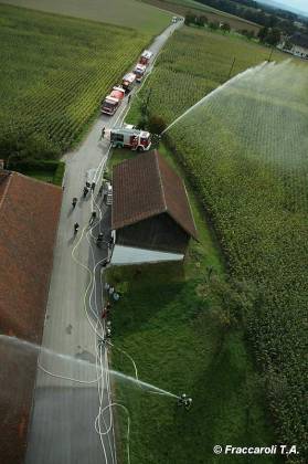 Die Übungsannahme lautete: Brand in einem Bauernhof, mehrere vermisste Personen. Die Wasserentnahmestelle war mehr als 1000m vom Einsatzort entfernt.