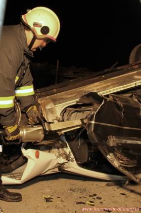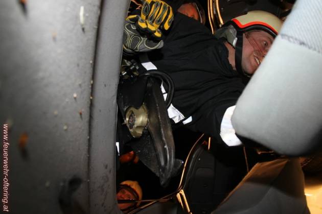 Der erste einsatzmäßige Übungsauftrag war eine Crash-Rettung einer Person über den Kofferraum. Binnen Minuten arbeiteten sich die Kameraden über die Heckklappe und die hintere Sitzbank zum liegenden Fahrer durch.