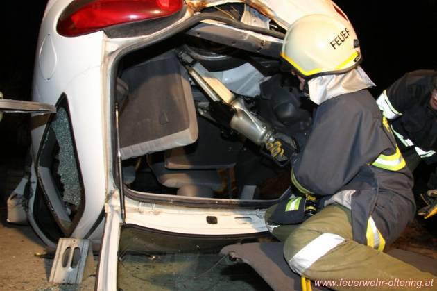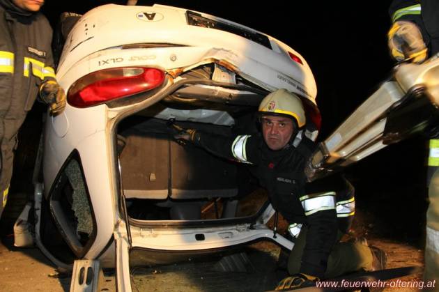Nachdem das Fahrzeug dann wieder auf die Räder gestellt wurde, folgte als nächster Übungsauftrag das oft notwendige Entfernen des Daches, um einen schonende Rettung der beiden Insaßen gewährleisten zu können.