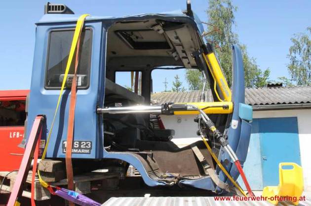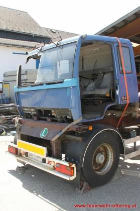 Das eigentliche Highlight des Übungsnachmittages war die Übung an einem LKW. Da bei oberösterreichs Feuerwehren ja stark der Sparstift angesetzt wird, konnte der Dräger TRT 7000 leider nicht nach Mistelbach gebracht werden :-) . Doch ein LKW-Anhänger und eine alte Kabine, welche von den findigen Kameraden auf dem Anhänger befestigt wurde, ersetzten das Übungsgerät geradezu perfekt. So konnte absolut realitätsgetreu die Rettung aus einer LKW-Kabine beübt werden - mit allen seinen Unterschieden zur Rettung aus PKW's wie der unterschiedlichen Höhe, dem unterschiedlichen Aufbau der Kabine selbst bis zur Thematik der Sicherung eines LKW's und die Fixierung der Kabine.
