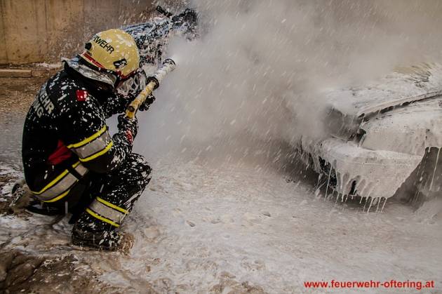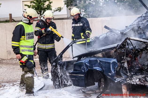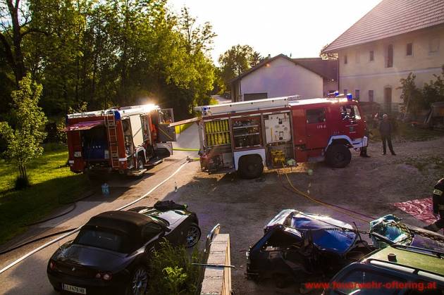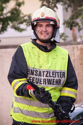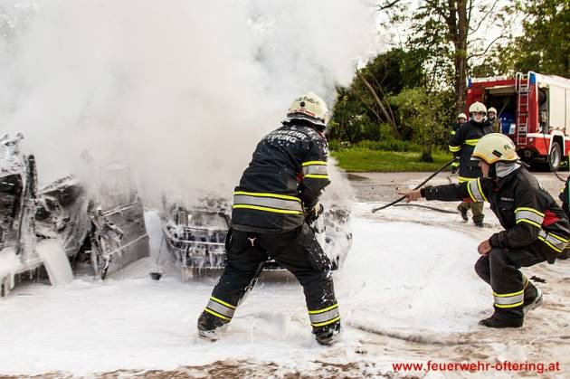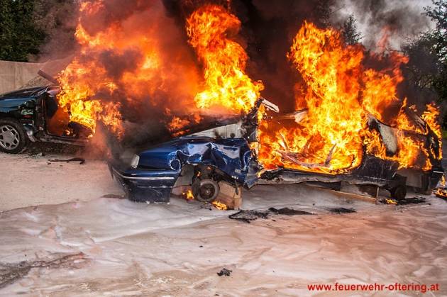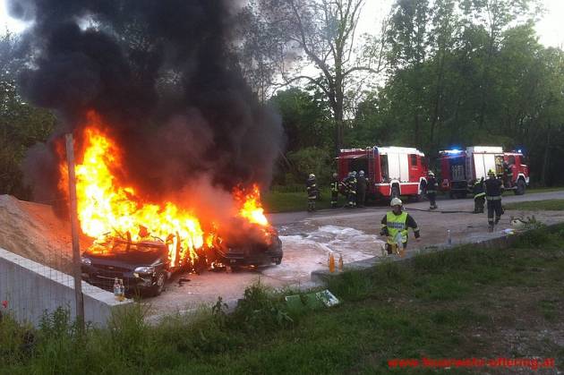 Einsatzleiter AW Roland Weber stellte bei der Erkundung einen Vollbrand von 2 Fahrzeugen fest und ordnete unverzüglich einen Schaumangriff mit 2 HD-Rohren an.