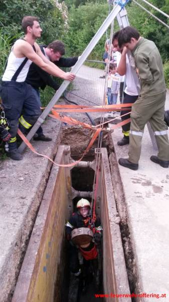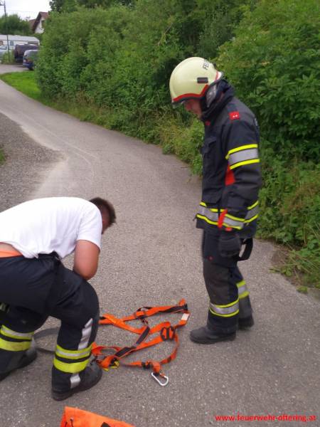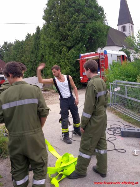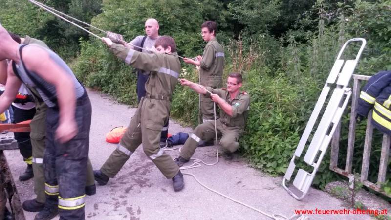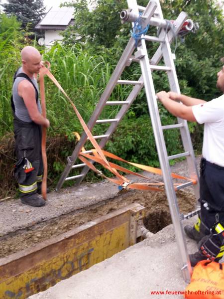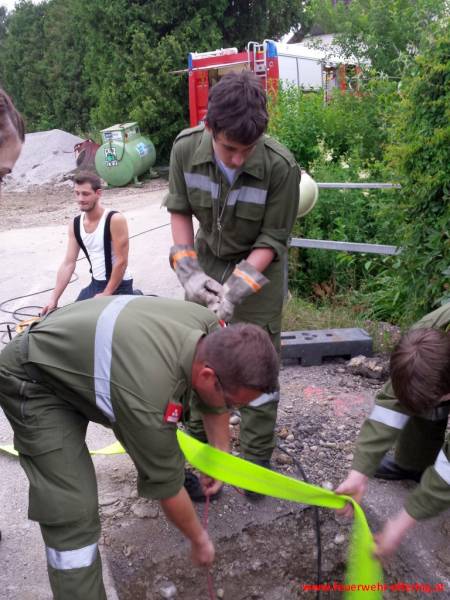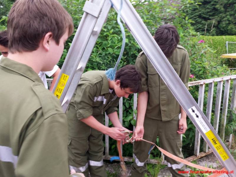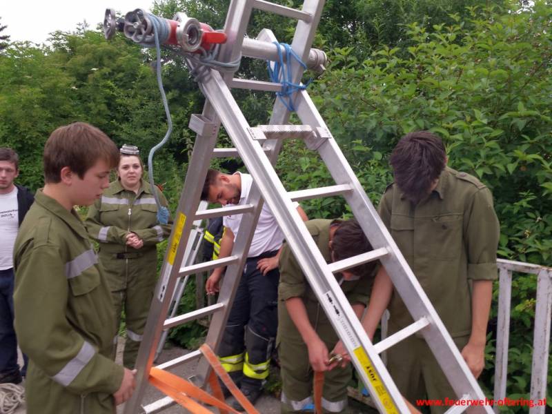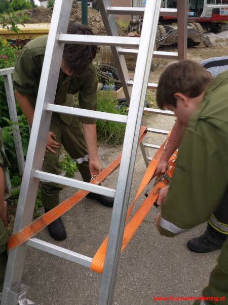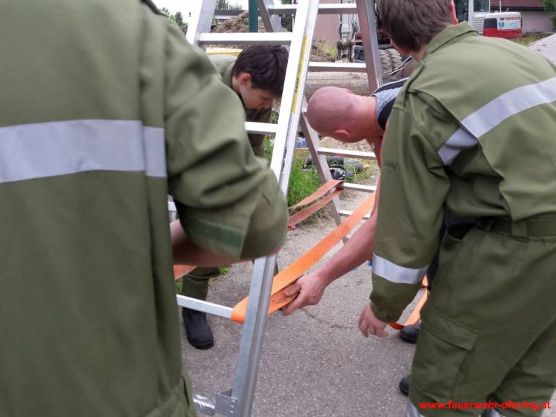 Um im Falle des Falles auch noch den Wald vor lauter Bäumen zu sehen, wurde eine behelfsmässige Lösung für die Personenrettung aus einfachsten, zur Verfügung stehenden Mitteln gebaut und beübt. Vor allem die Jungfeuerwehrmänner und Frauen waren von der Effizienz und Einfachheit der Lösung begeistert. Aufgrund diverser Umbauarbeiten im Ort, boten sich auch noch die perfekten, realistischen Voraussetzungen. Unser "Hoiz-Weibi" durfte wie immer das Opfer spielen und trug ebenfalls zum nötigen Realismus bei.