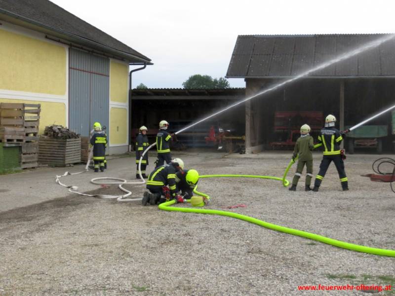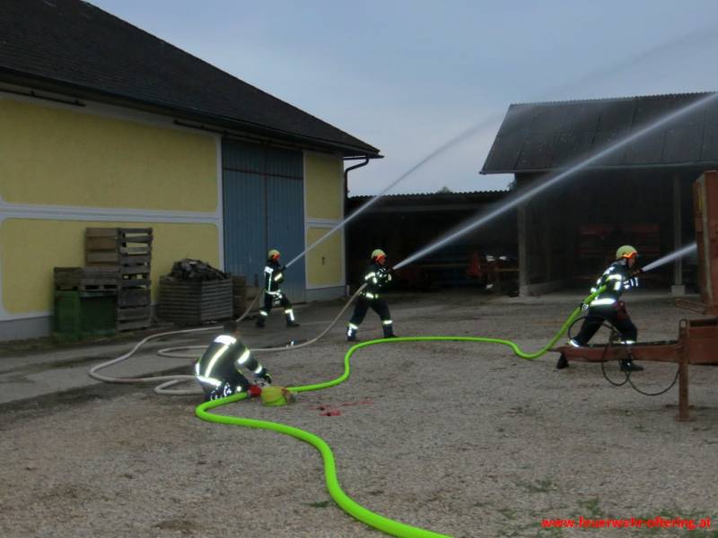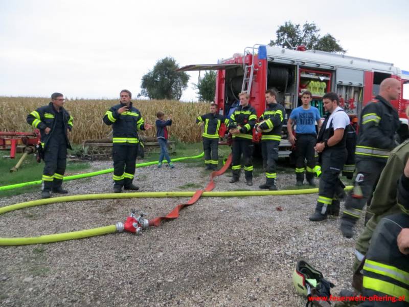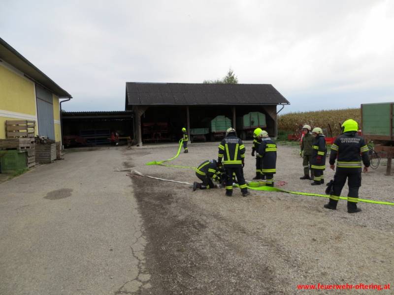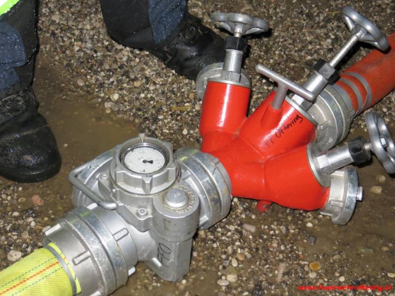 Aufbauend auf der Übung vom Juni, wurde mit der Tragkraftspritze Fox und dem TLF eine Relaisleitung simuliert. Die Teilnehmer mussten an den jeweiligen Geräten für eine (druck-)konstante Wasserversorgung an den Strahlrohren sorgen, welche ständig geöffnet und geschlossen wurden. Somit konnte jeder den Aufwand der Maschinisten und das Verhalten der Geräte und der Versorgungsleitung in unterschiedlichsten Situationen sehen und musste entsprechend reagieren. Gegen Ende der Übung wurden noch einige Kniffe verraten, um zumindest einen Teil der Arbeit der vorhandenen Ausrüstung automatisch zu überlassen und die Zubringerleitung entsprechend zu schützen.