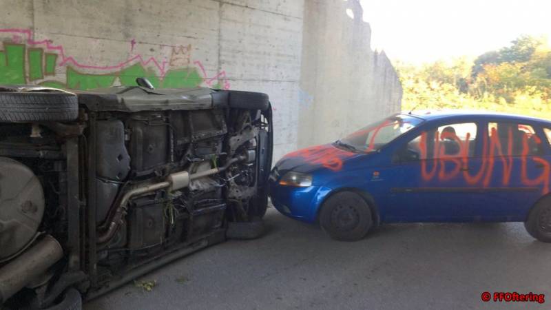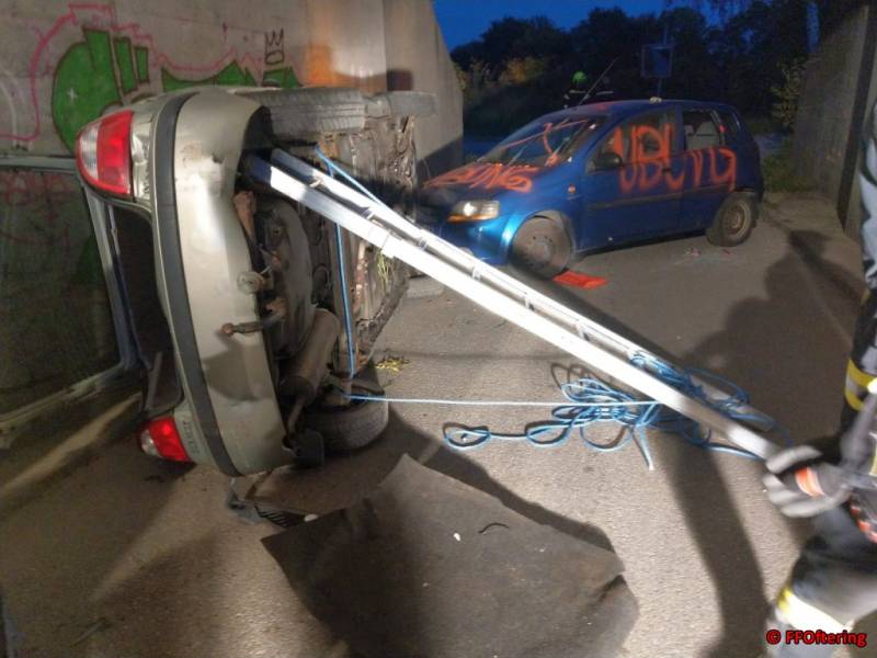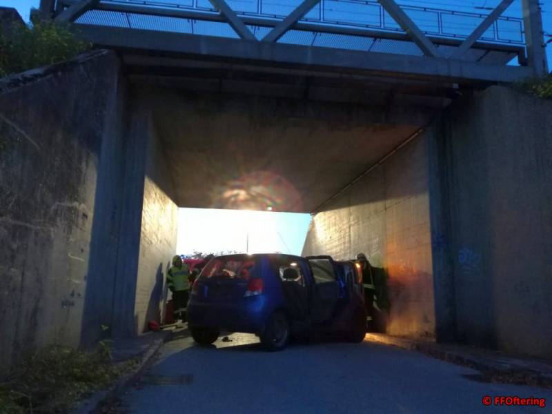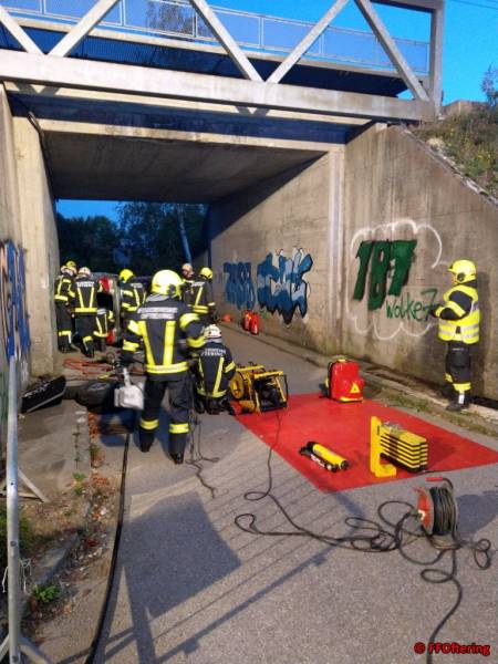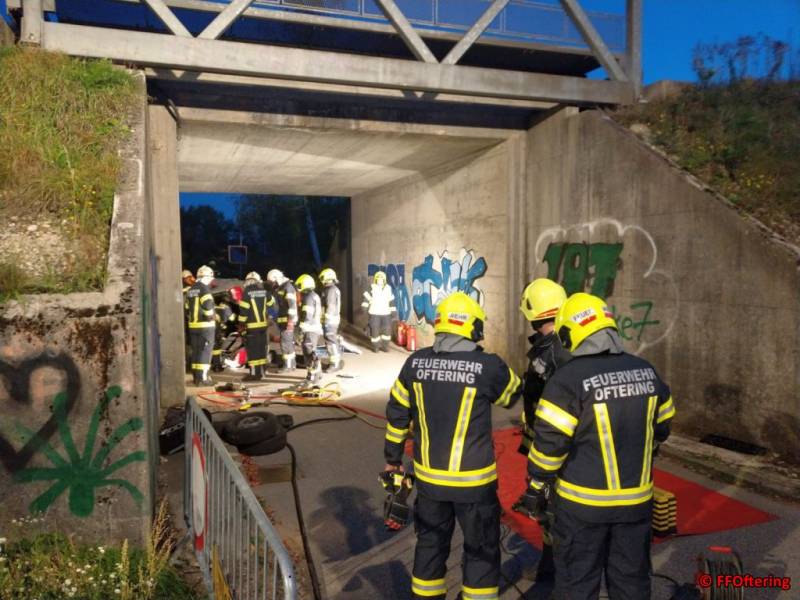 Das erste Fahrzeug stand noch auf den Rädern und die Rettung der eingeklemmten Insassen war somit kein Problem. Das zweite KFZ lag auf der Seite, mit einem, durch die Mauer der Unterführung, beschädigten Dach. Somit wurde der Weg über den Kofferraum gewählt, um die verunfallten Personen schnellstmöglich zu befreien.