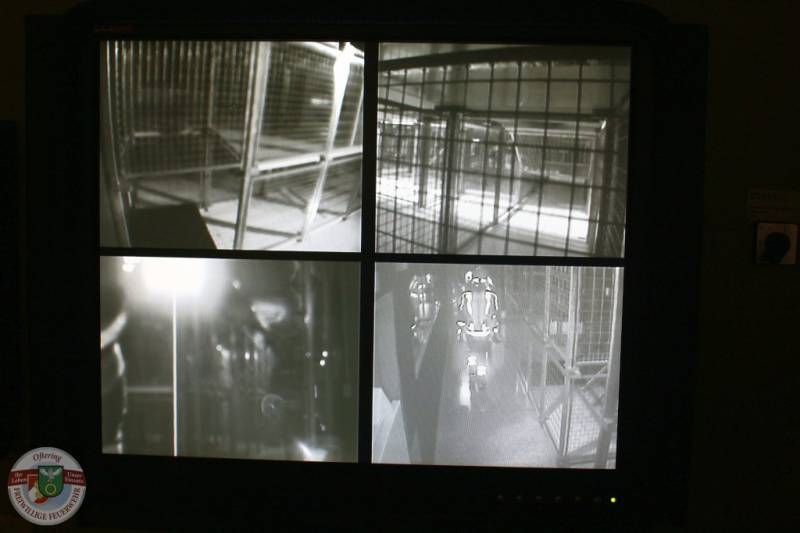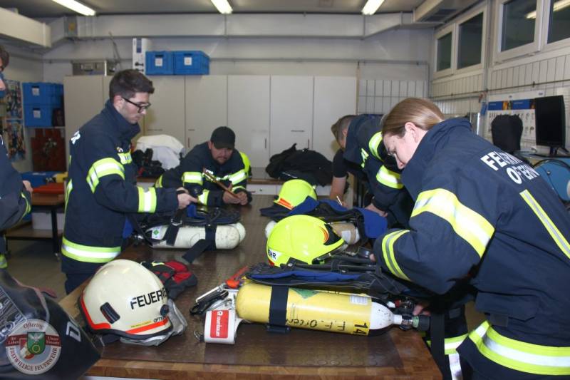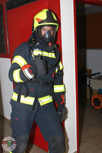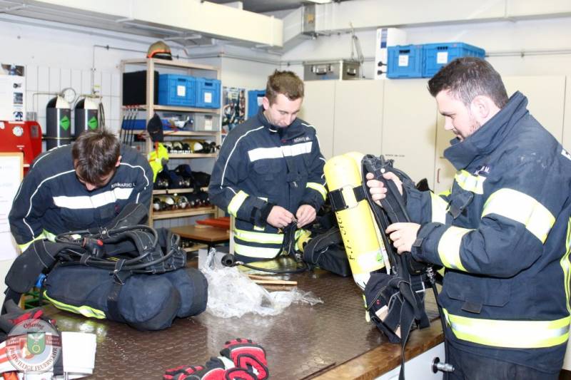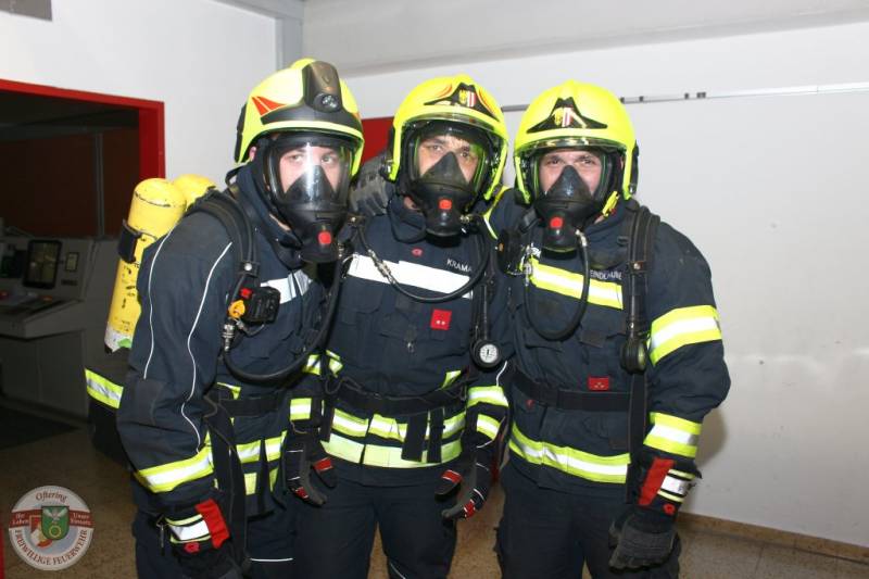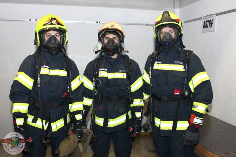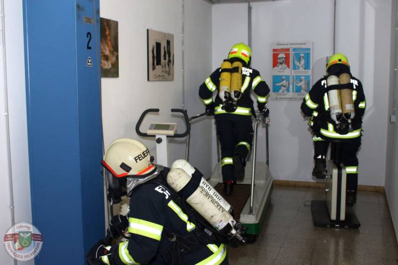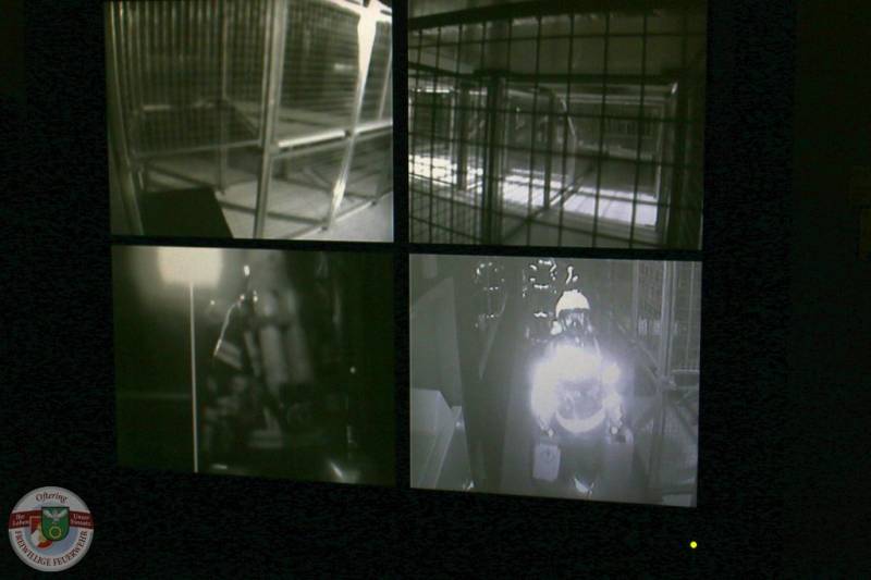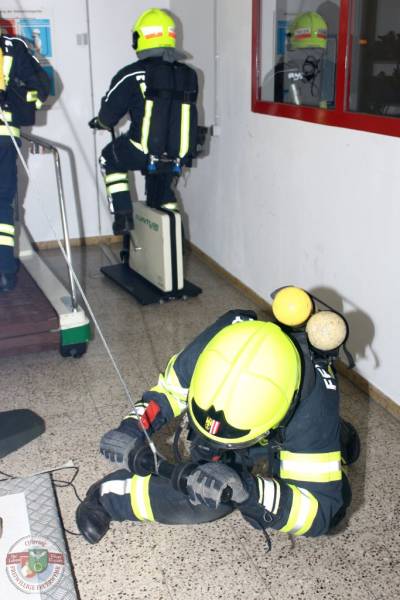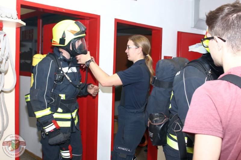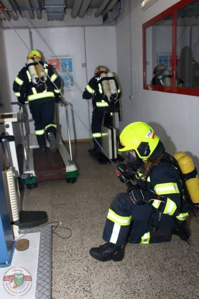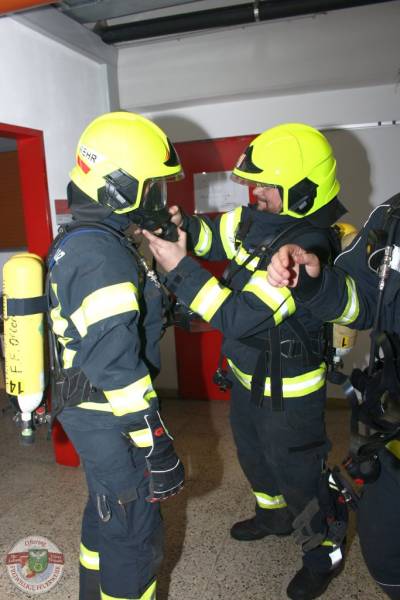 Zwei Atemschutztrupps besuchten die Atemschutzstrecke in Wels, um ihr Können und ihre Fitness unter Beweis zu stellen. Bei absoluter Dunkelheit müssen verschiedene Aufgaben in einer Art Labyrinth aus einem Gitterkäfig absolviert werden.
