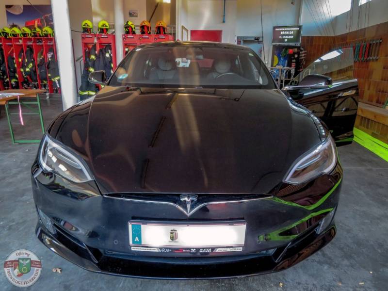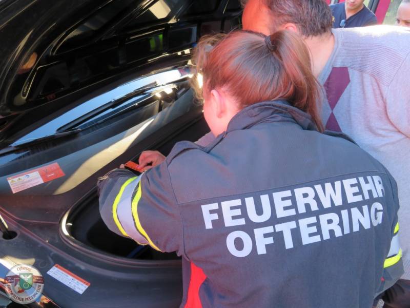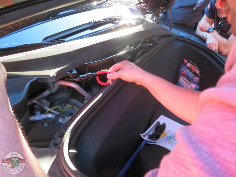 Im Anschluss folgte die ersehnte Praxis und zwei Teslas und ein BMW i3 konnten direkt vor Ort begutachtet werden, die Rettungskarten-Theorie damit direkt mit dem Objekt abgeglichen werden. Die Fahrzeuge wurden von den Kameraden wie rohe Eier behandelt, die Besitzer erlaubten, sehr entspannt, die Entfernung der notwendigen Abdeckungen. Neben der ein oder anderen Probefahrt, wurden sämtliche Fragen, rund um die e-Autos, von den Besitzern beantwortet.