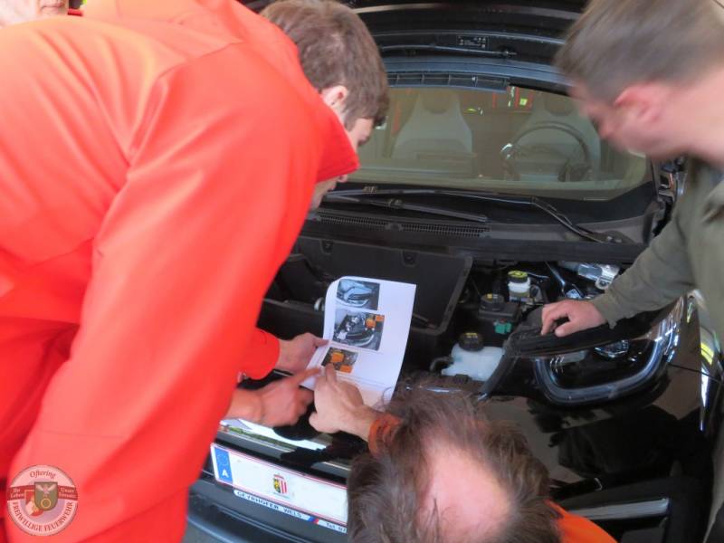 Eine Schulung bei der Feuerwehr klingt immer etwas langweilig, denn die Kameraden lieben die Praxis. Leider ist es nicht immer möglich, praktisch zu üben. Das vorhandene Wissen muss trotzdem stets erweitert werden, um bestmöglich auf aktuelle Anforderungen reagieren zu können. Nach der eher trockenen Theorie, wie Rettungskarten funktionieren und der Erkenntnis, dass Standards nicht immer ihren Namen verdienen, konnten einige Rettungskarten analysiert werden. Hier wurde schnell klar, dass es sich nicht um irgendwelche Modelle handelte, sondern ein Grossteil der Fahrzeuge der Feuerwehrmitglieder abgedeckt wurde. Nebenbei gabs noch die zugehörigen ÖAMTC-Aufkleber, um allen Einsatzkräften zu zeigen, dass die Rettungskarte mitgeführt wird. Als potentiell Betroffene, sollten wir mit gutem Beispiel voran gehen - Danke an den Übungsverantwortlichen!
