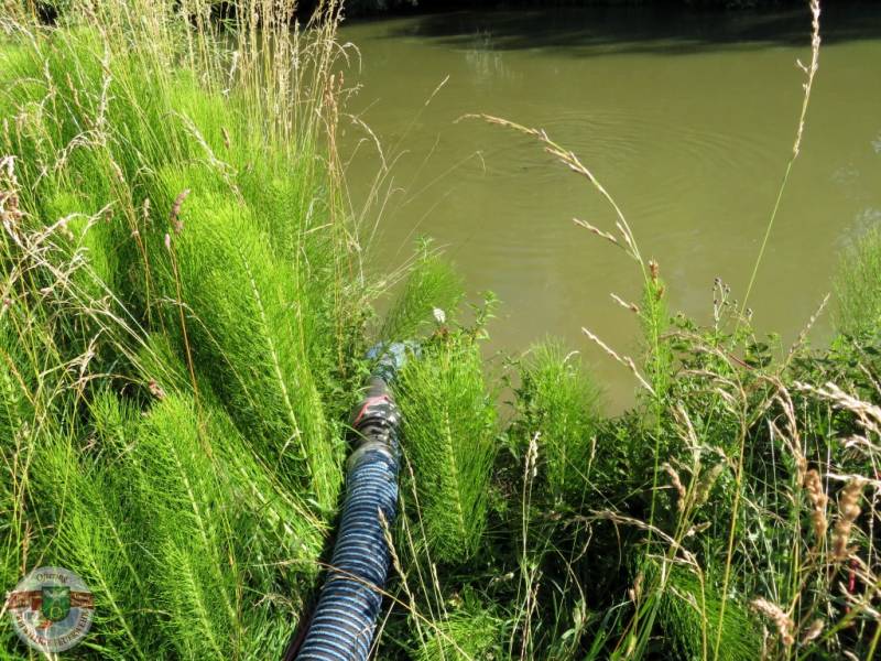 Unser Tank wurde als Speicher seitlich vom Gebäude platziert, um den Brand mit 2 C-Rohren von der hinteren Seite des Gebäudes bekämpfen zu können. Das LFB musste von einem Teich in der Nähe eine zusätzliche Versorgungsleitung aufbauen, um die Wasserversorgung abzusichern.