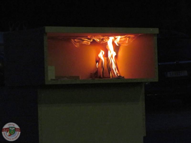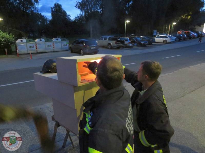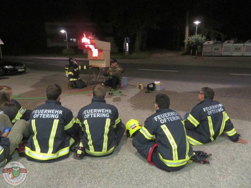 Das 2. Modell zeigte einen geschlossenen Raum inkl. nachfolgender Decke. Hier konnte gezeigt werden, welche Auswirkungen kurzes Kühlen durch den vorrückenden AS-Trupp hat, wie sich der Brand bei geschlossener bzw. offener Tür verhält und vor allem, welche Gefahr durch die Rauchgase ausgeht und wie schnell diese zünden können, wenn alles passt.