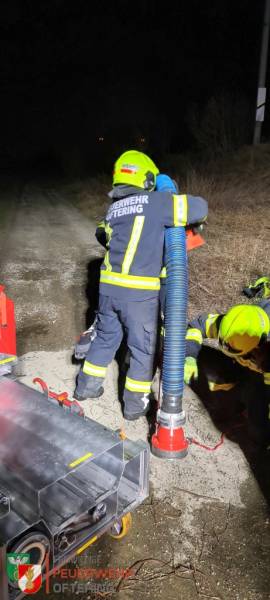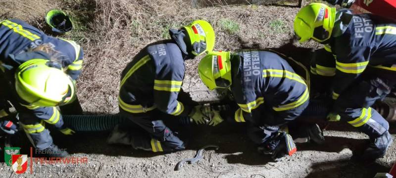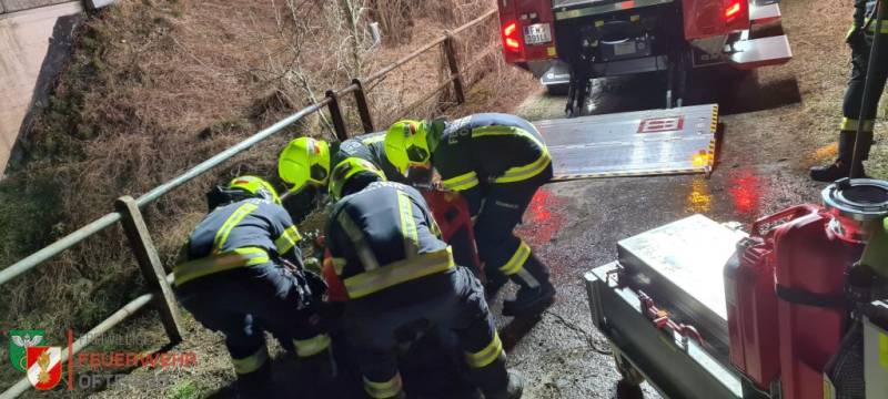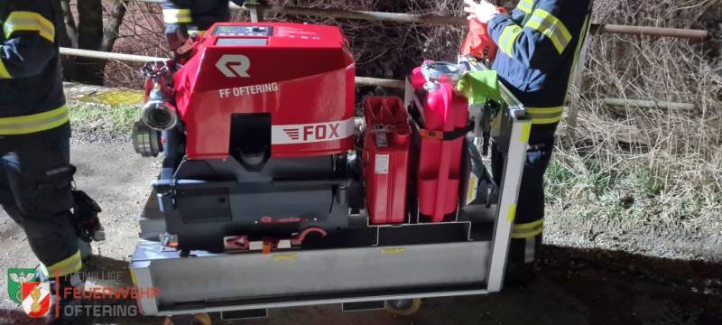 Aus dem stehenden Fahrzeug musste der Rollcontainer Saugstelle entladen, die Fox positioniert und eine Saugleitung zu dem vorbeifliessenden Bach verlegt werden. Sobald an beiden Abgängen der Tragkraftspritze, die C-Strahlrohre mit 200 l/min versorgt waren, stoppte die Zeit.