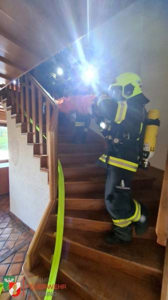 Übungsannahme war ein Brand, inkl. vermisster Person, am Ende des Wohnbereiches im Gasthaus zur Haltestelle. Der Atemschutztrupp musste schnellstmöglich die vermisste Person finden und retten, sowie den Brand löschen.