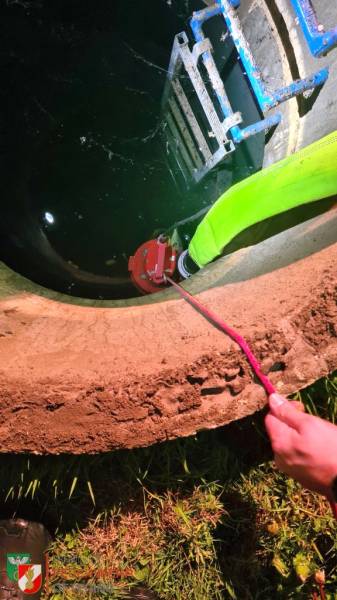 Kann ein B-Strahlrohr mit dem Tank als Puffer und einer Tauchpumpe als Wasserversorgung aus einem Löschbecken mit ausreichend Wasser versorgt werden? Ein Worst-Case-Szenario, das hier beübt wurde. Aber ja, es funktioniert!